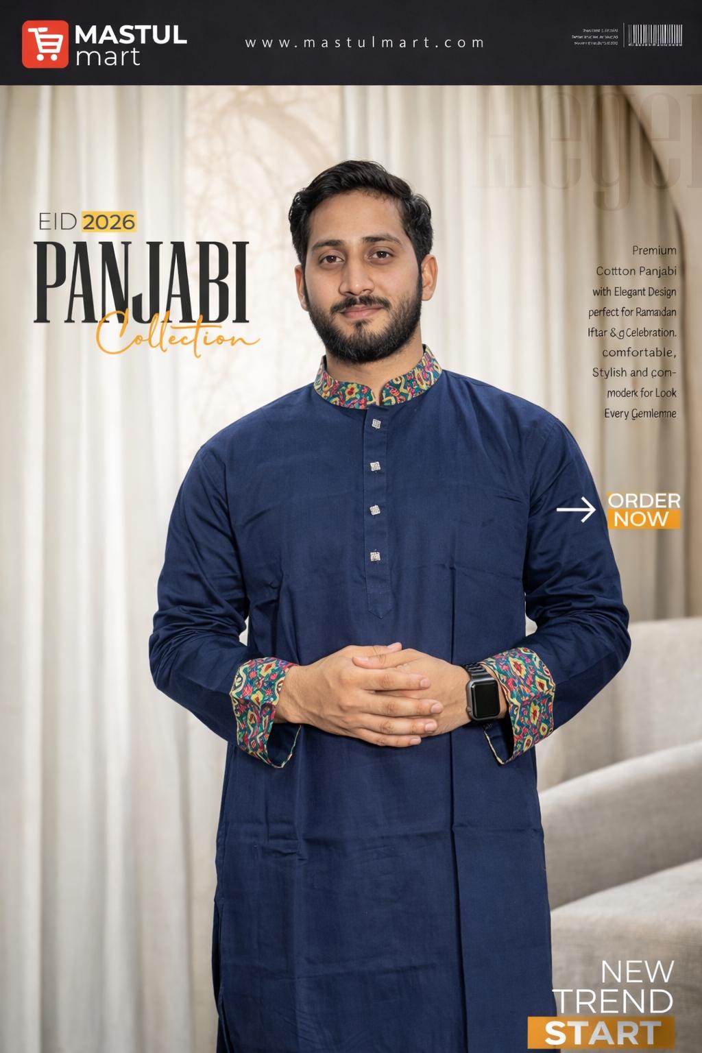Crafted from premium cotton fabric, this Panjabi ensures all-day comfort, breathability, and a refined fit. The rich navy tone offers versatility, while the colorful accents bring a fresh and youthful vibe—perfect for Eid celebrations, family gatherings, and special occasions.