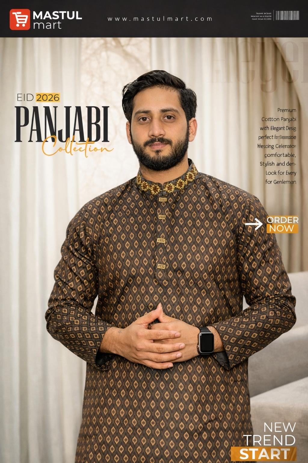 Made from premium cotton fabric, this Panjabi ensures comfort, breathability, and durability for long hours of wear. The warm brown tone combined with golden accents creates a sophisticated aesthetic—perfect for Eid, festive gatherings, and special occasions.