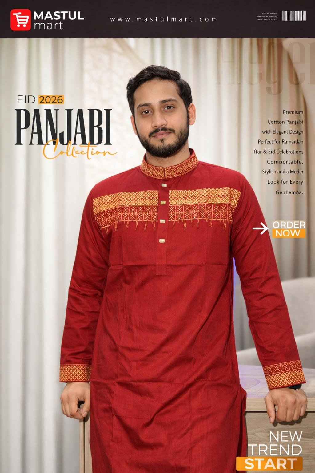 The soft and breathable cotton fabric ensures maximum comfort, while the detailed craftsmanship adds a regal touch to your overall look. Perfect for Eid, Ramadan gatherings, weddings, and special occasions, this Panjabi blends cultural heritage with contemporary fashion.